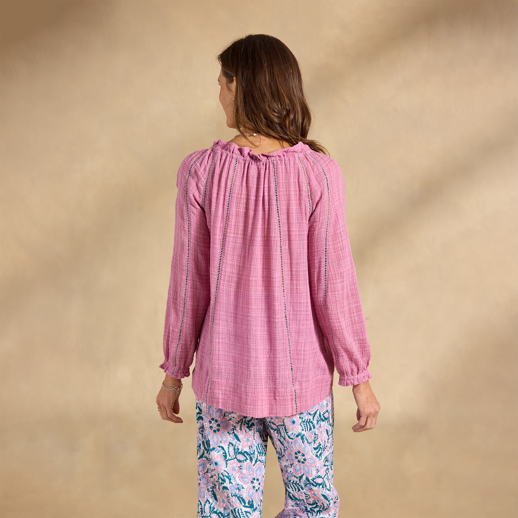 Embrace your artistic spirit in our sheer. easy-fit top with ladder lace. ruffle neckline and tassel ties. Cotton/viscose. Hand wash. Imported. Exclusive. Sizes XS (0?C2). S (4?C6). M (8?C10). L (12?C14). XL (16?C18). XXL (20?C22). Approx. 26.5l