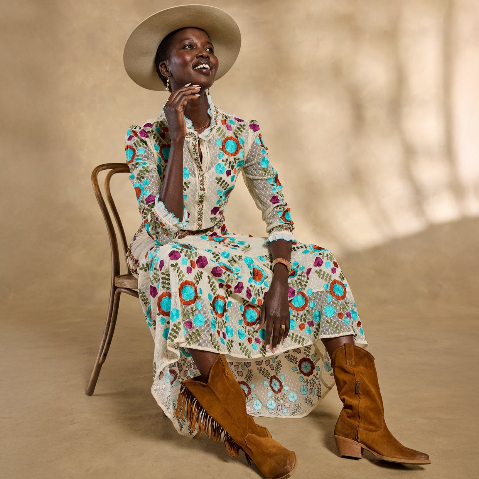 An absolute showstopper. our Ary Embroidered Maxi Dresss is a sleek. figure-flattering column of drama??featuring delicate mesh. brilliant allover floral embroidery and feminine lace at the neck and bracelet-length sleeves. Button front; fully lined. Hand wash. Imported. Sizes XS (0?C2). S (4?C6). M (8?C10). L (12?C14). Approx 56l.
