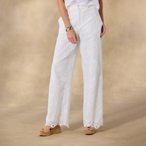 Sporty and feminine. our cotton gauze. eyelet pants are loose and flowing. with wide-leg silhouette. scalloped hem. side seam pockets and back patch pockets. Fully lined. with button closure zip fly and tie at waistline. Machine wash. Imported. Exclusive. Sizes 0?C14. 27.5 inseam