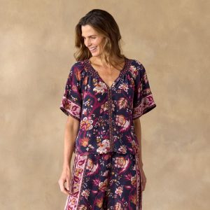 Silky and gorgeous mixed and border print pajama top. so elegant with smocked neckline and eyelet laundry button front. Easy fit. Viscose. Machine wash. Imported. Exclusive. Sizes XS (0–2). S (4–6). M (8–10). L (12–14). XL (16–18). XXL (20–22). Approx. 23l.