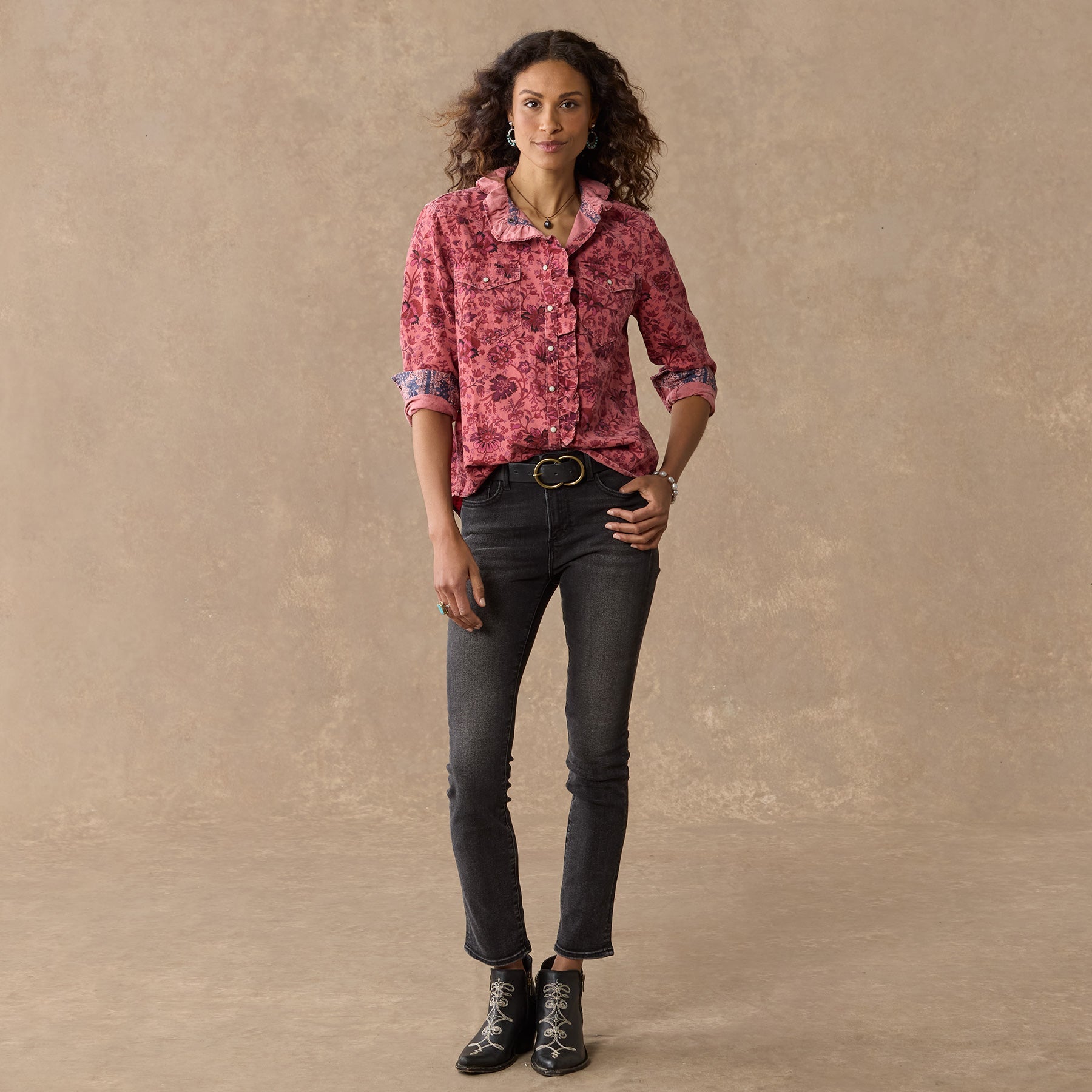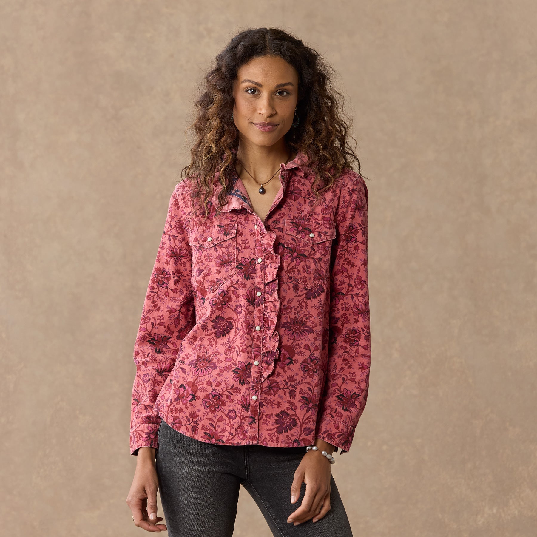 Floral printed and over-dyed. this Western inspired. soft corduroy shirt is beautiful with ruffles at the neckline for a feminine twist. Two patch pockets. snap closure and bandana print detail inside. Cotton. Machine wash. Imported. Exclusive. Sizes XS (0??). S (4??). M (8??0). L (12??4). XL (16??8). XXL (20??2). Approx. 26l.