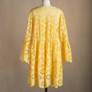 Stunning open eyelet sets the stage on our ruffle tiered dress with scalloping at the sleeves and hem. lovely embroidery at the placket. Removable slip included. Cotton. Hand wash. Imported. Exclusive. Sizes XS (0-2). S (4-6). M (8-10). L (12-14). XL (16-18). XXL (20-22). Approx. 36l.